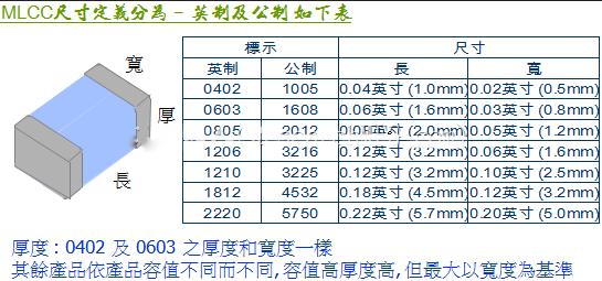 依照MLCC產品【尺寸】的大小分類 : 0402 ; 0603 ; 0805 ; 1206 等。