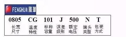風華貼片電容:例如:0805 CG 101 J 500 N T