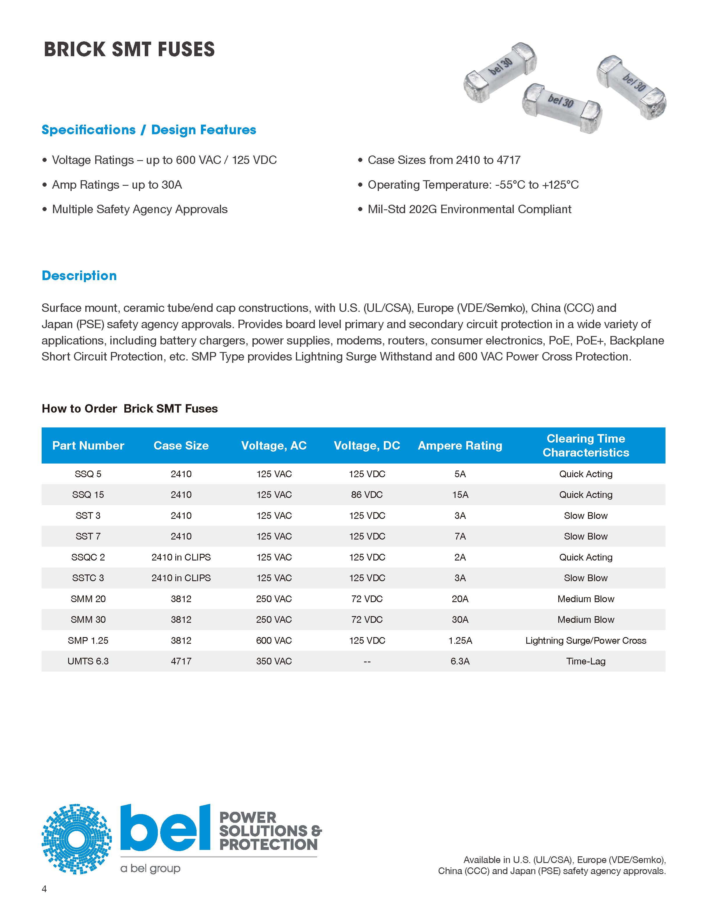 表面貼裝,陶瓷管/端蓋建筑,與美國(UL / CSA),歐洲(VDE / SEMKO),中國(CCC)和日本(PSE)安全機構批準。 提供各種各樣的板級初級和二級電路保護應用,包括電池充電器,電源,調(diào)制解調(diào)器,路由器,消費電子,PoE,PoE +,背板短路保護等。SMP型提供閃電浪涌耐受和600 VAC電力交叉保護