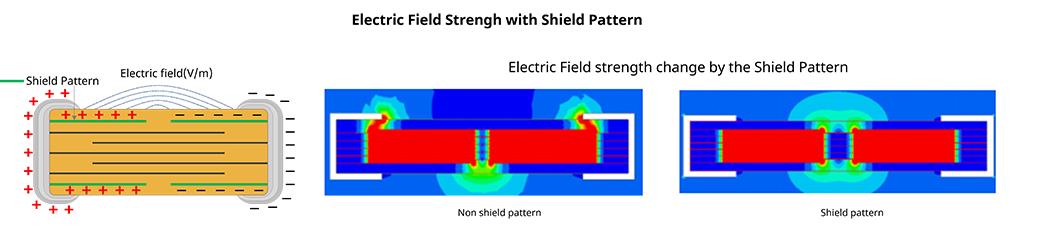 高壓MLCC結(jié)構(gòu)與一般MLCC 相比有何不同呢?在高電壓環(huán)境下需要確保可靠性。暴露在高壓環(huán)境下的MLCC有Arc-ove的危險(xiǎn),MLCC內(nèi)部存在短路的危險(xiǎn)。當(dāng)向MLCC施加高電壓時(shí),MLCC周圍會形成強(qiáng)電場(Electric field),進(jìn)而產(chǎn)生ionized air。尤其是在MLCC端電極部位集中了大的電場(Electric field)。如果在Ionized air中超過了啟動電壓(inception voltage)就會發(fā)生電 Arc,MLCC 內(nèi)部就會有發(fā)生circuit short 的危險(xiǎn)。防止這種現(xiàn)象產(chǎn)生的結(jié)構(gòu)是shield pattern。